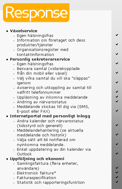 SyfteVi svarar åt dig. Du använder dig av CALL4U Response när du har behov av att någon svarar när det ringer. Ska du ut och resa, vara ute på jobb eller kundbesök, vill ha ett professionellt bemötande till dina kunder, är sjuk eller på semester, sitter i sammanträde och inte vill bli störd – då väljer du oss. Med några enkla knapptryckningar på din telefon (mobil, kontorstelefon) kopplar du över alla samtal till oss. När någon sedan ringer ditt telefonnummer svarar Call4U vänligt och professionellt i ditt företags namn. Vi blir din växel. Vi ger dina kunder personlig service, då vi känner ditt företag. Har du lämnat ett meddelande vidarebefordrar våra telefonister budskapet till de som ringer. Vi tar också emot eventuella meddelanden – som sekundsnabbt sänds till dig på önskat sätt via mail, sms eller Internet. Du kan också samla ihop meddelanden till en viss tidpunkt. TjänstenMed Call4U response talsvarstjänst ökar du tillgängligheten och service nivån för dina kunder. Vi värnar för dig som kund att det skall vara enkelt att starta resp. avsluta tjänsten.